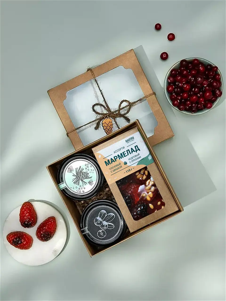 Варенье из сосновых шишек с кедровым орехом - 100 мл; Клюква в сосновом сиропе - 100 мл; Мармелад с сосновой шишкой - 110 гр